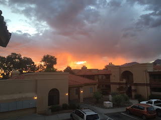 Van de lente met lekkere temperaturen, die in mei iets koeler waren dan normaal (koudste mei sinds '88), vliegen we meteen en op korte tijd naar hete temperaturen. De leuke 27-33 graden maken plaats voor triple digits, temperaturen boven de 100F, wat 38 graden Celsius betekent. Na enkele weken van constante triple digits, was het deze week voor het eerst weer wat 'koeler' , net onder de 100F. Juni is een van de droogste en heetste maanden hier, maar als de monsoon zich vroeg aandient, kan het ook plotseling erg hard beginnen te regenen en te onweren, waardoor de temperatuur plotseling van 108 naar 70F gaat (42 naar 21C)